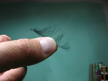 Take a CDC feather and stroke the fibres so that they are at a 90 degree angle to the stalk. Do the same with a second feather and then place them one on top of the other.
