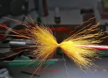The tying sequence below shows a variation made by Danish fly tyer Kim Sørensen, who has added a small disc in the rear of the fly. This has the purpose of lifting the hair. Marc notes that this makes the collar wider and the fly less willing to sink. Marc himself ties his flies slimmer and tighter. Marc also ties different sizes of the fly, from a Micro Plug to a fly more in tune with most tube flies for salmon.