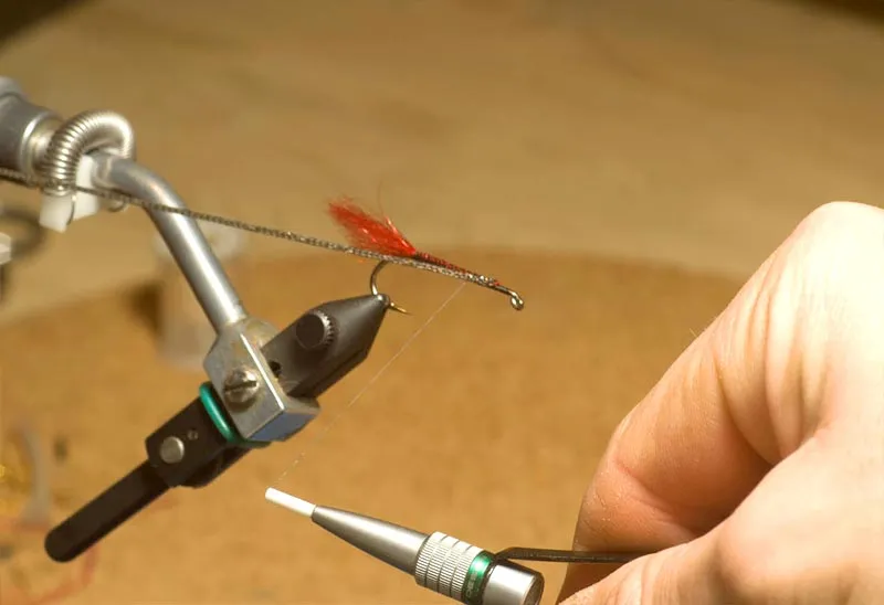 Tie in the tinsel, again in the front of the body, covering it with thread wraps all the way to the hook bend to form a smooth foundation