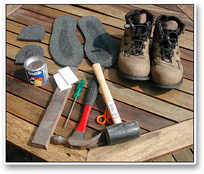 You will need amongst other things: heavy pliers, scissors or a knife, contact glue, some disposable tool for spreading the glue (I used cardboard), a hammer or another heavy object and a rubber mallet if you want to attack your own felted wading boots.